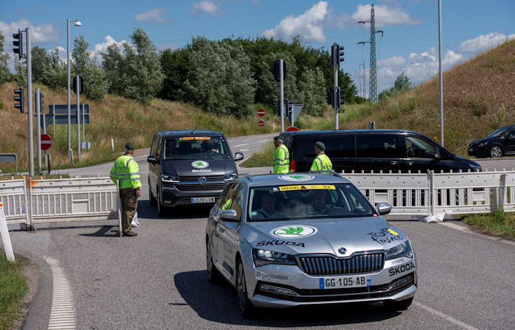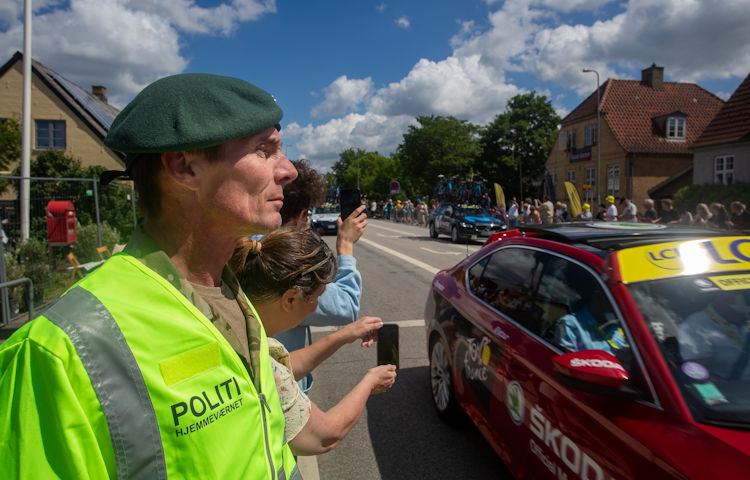Som om verdens største cykelløb ikke var en stor nok opgave, så er lørdag den 2. juli, hvor etapen starter i Roskilde, også kulminationen på dette års Roskilde Festival. En af Europas største musikfestivaler. Her er Hjemmeværnsdistrikt Midt og Vestsjælland også til stede med soldater, der står for trafikregulering.