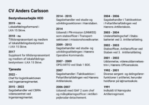 Mit navn er Anders Carlsson, jeg bor Oddense, som er en lille landsby nordvest for Skive. Jeg er gift og har to børn. Her har jeg i en årrække været aktiv i bestyrelsesarbejde (senest som formand) i den lokale skolebestyrelse. Når jeg har fri, kan jeg godt lide at cykle. Jeg har også planer om, at inden længe skal en gammel interesse for havfiskeri afprøves igen. Jeg blev indkaldt til Forsvaret i 1991 som værnepligtig i Skive og har været i Forsvaret siden. Jeg har været i Artilleriet, 1. Brigade, Hærkommandoen (dengang det hed HOK og Hærstaben), og nu er jeg så i Skive ved Ingeniørregimentet. Jeg har således oplevet Hæren mange steder og haft forskelligt perspektiv på, hvad der skal til, for at Hæren er en god arbejdsplads.