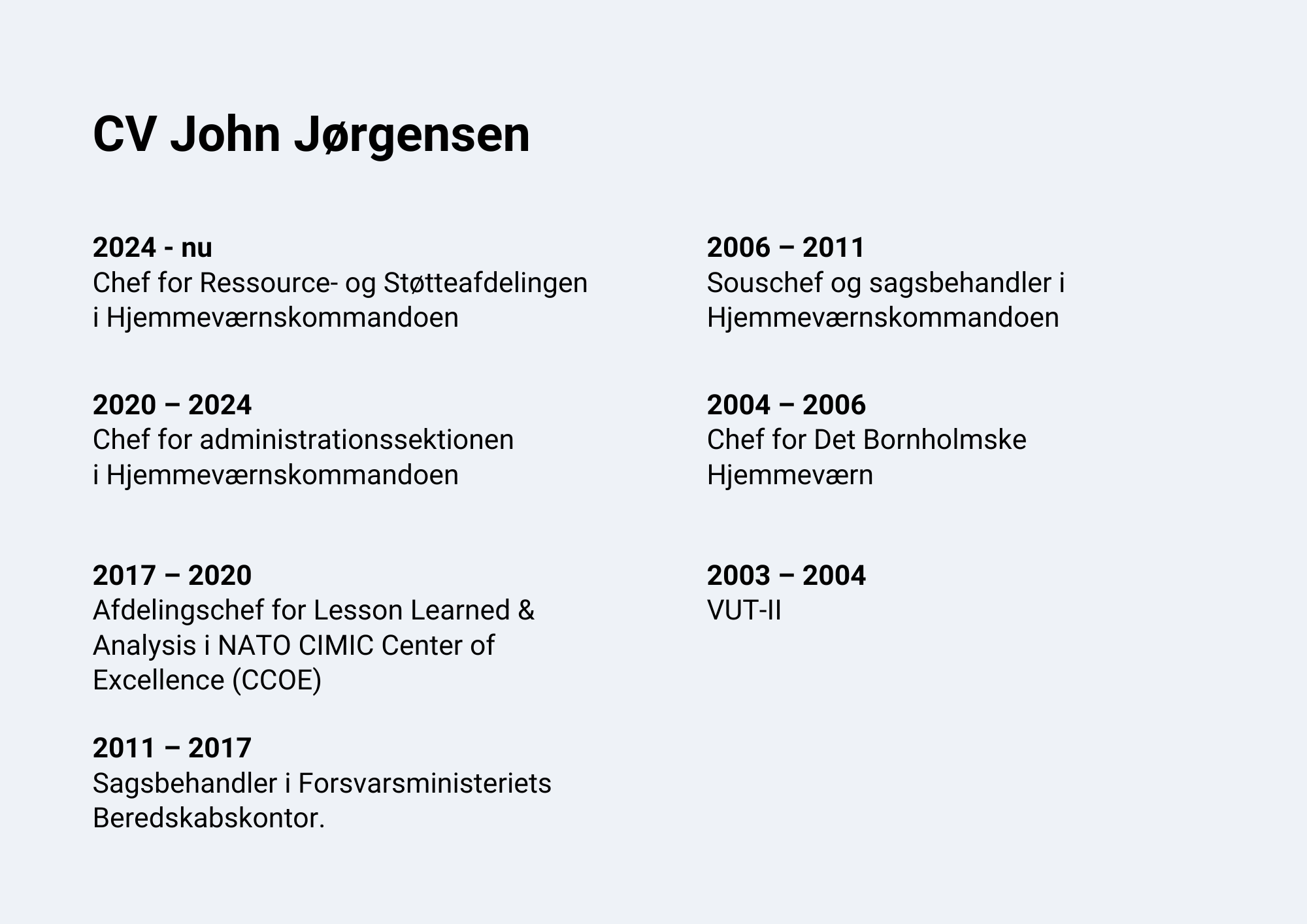 Mit navn er John Jakobsen, og jeg bor på Frederiksberg. Jeg har været ansat i Forsvaret siden 1987, og jeg har arbejdet ved Hjemmeværnet i hele min karriere på alle niveauer fra distrikt til kommando – dog med et par afstikkere til Haag i Holland, hvor jeg var afdelingschef i CIMIC Center of Excellence, og Afghanistan (Resolut Support).