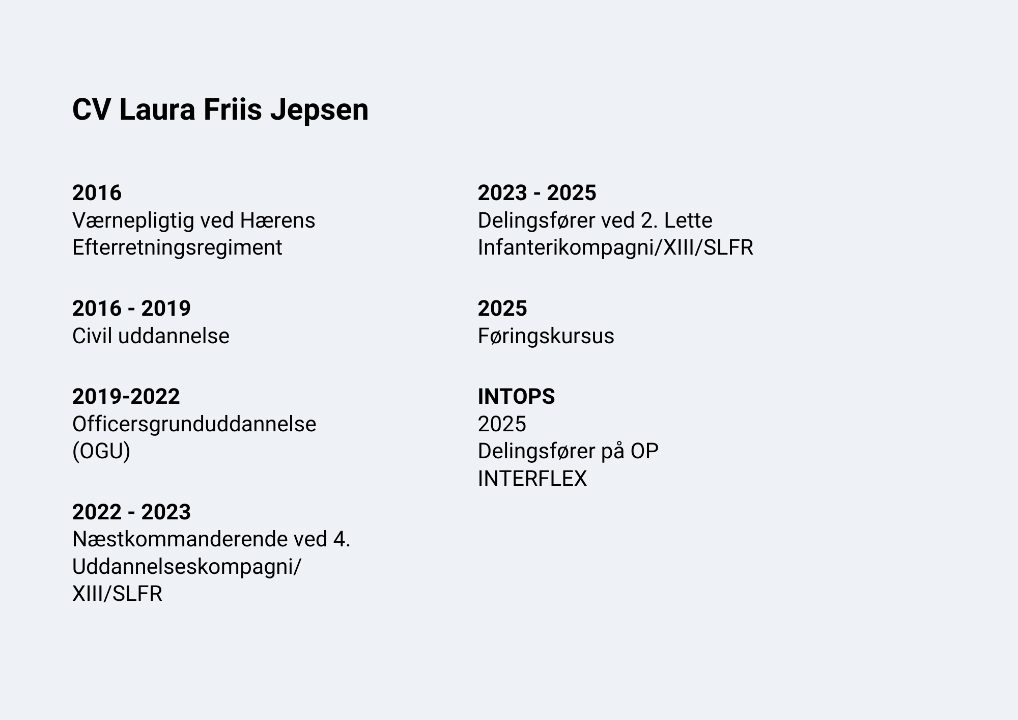 Premierløjtnant Laura Friis Jepsen, 29 år HB-medlem Hæren. Kursist på føringskursus 2025-II.